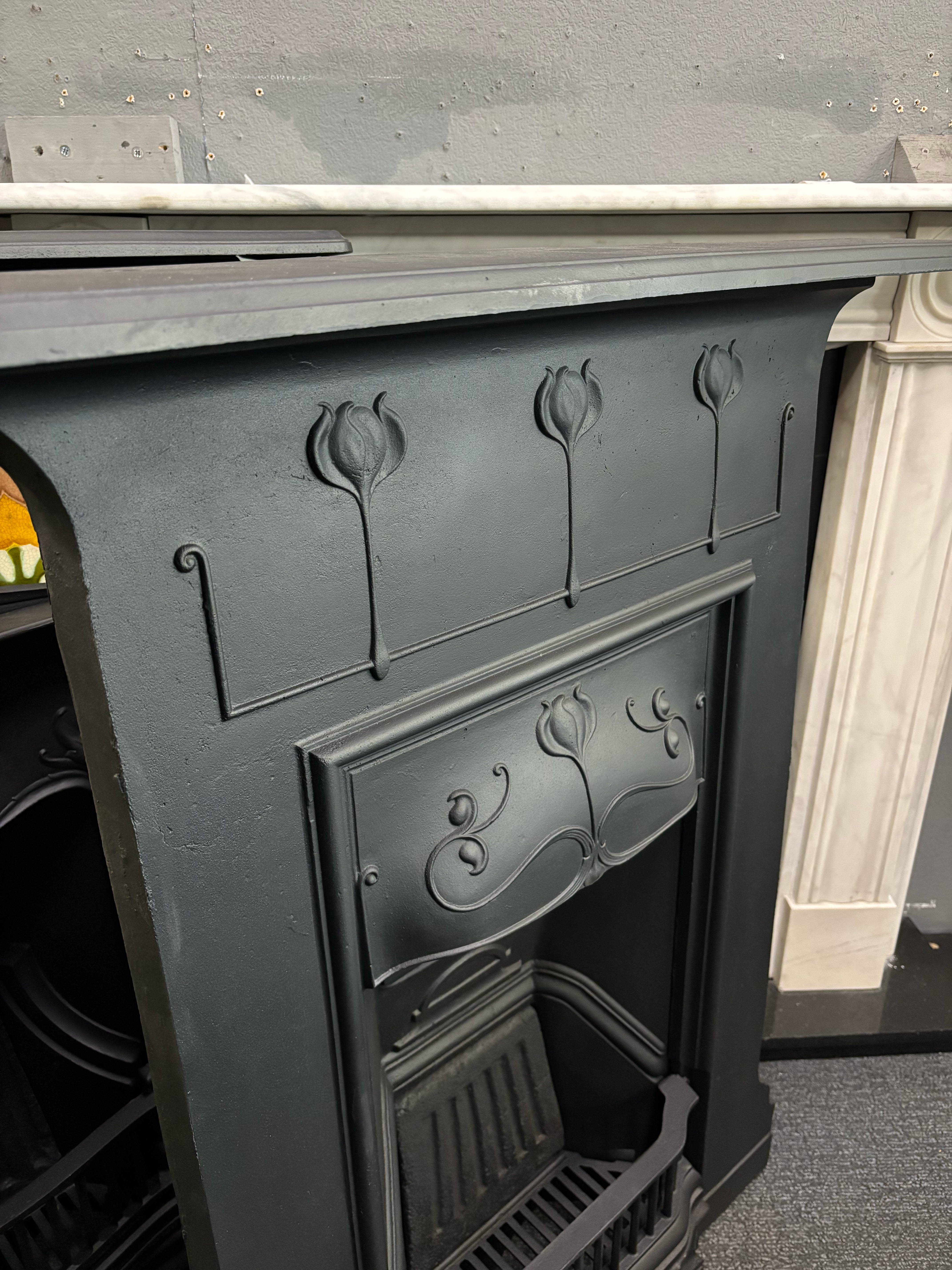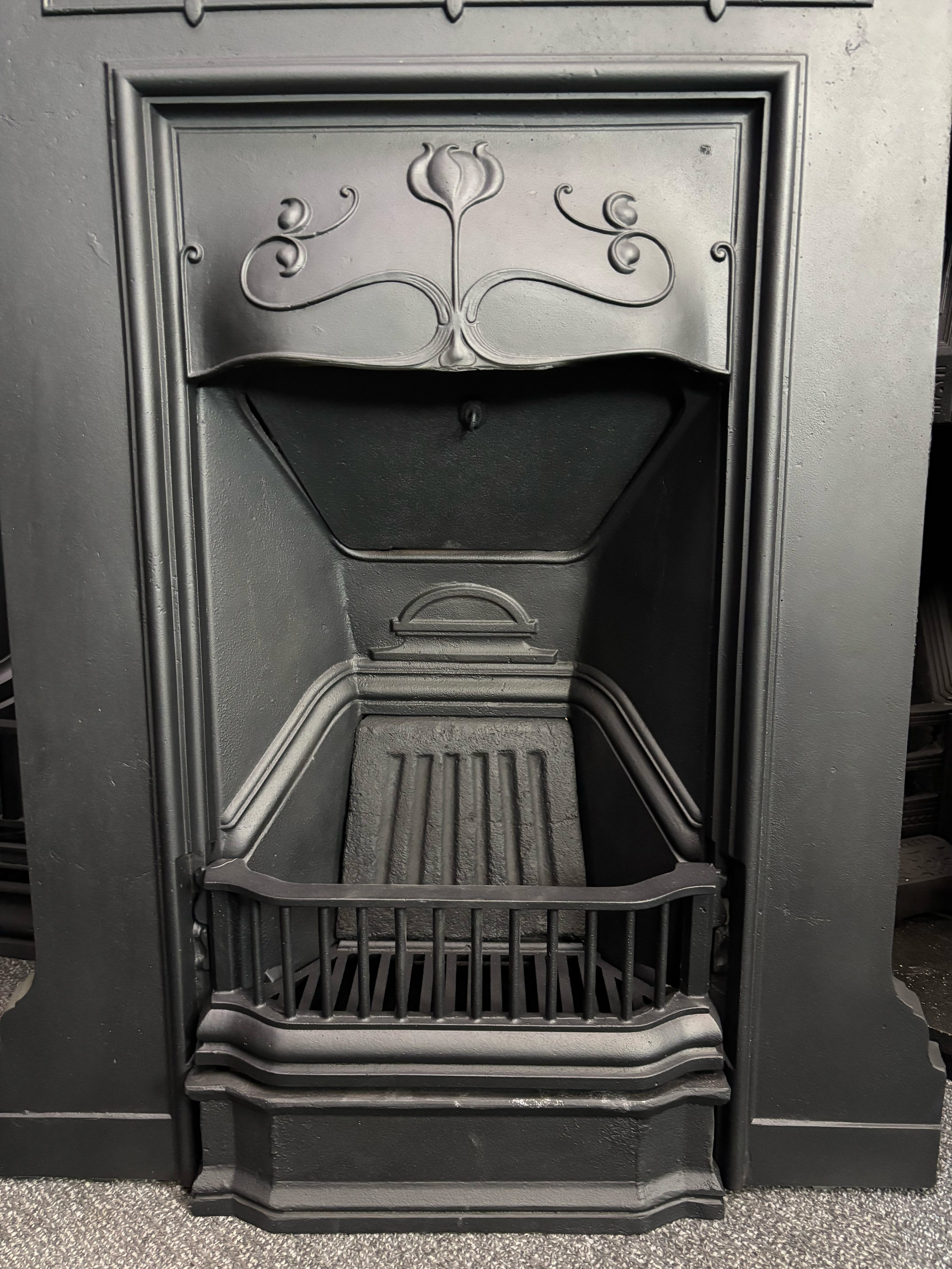 Art Nouveau cast iron combination fireplace with flowing floral detailing and a hood, finished in our signature black. This period-style fireplace makes a bold focal point, perfect for adding character to both traditional and modern interiors.