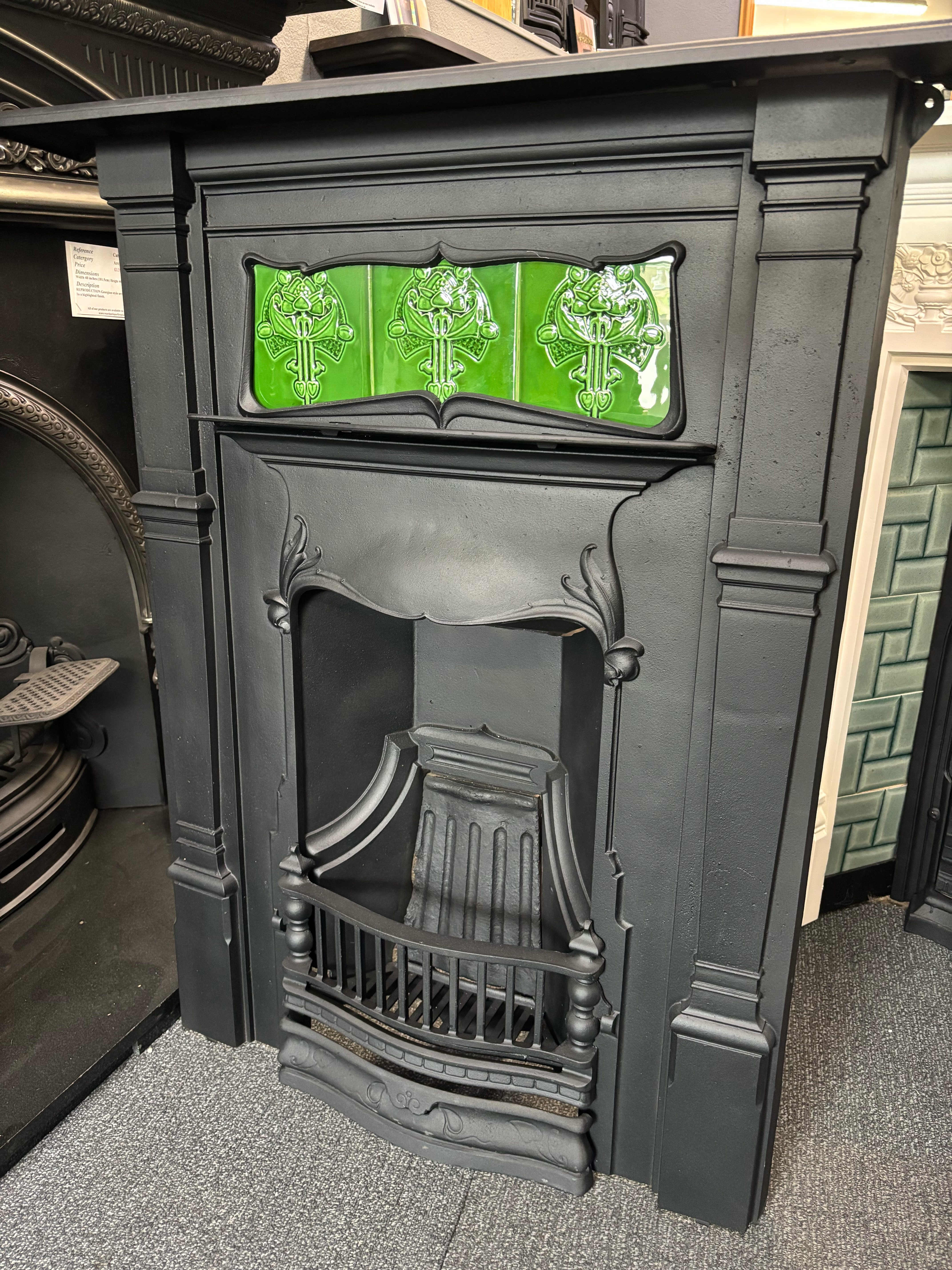A stunning cast iron Art Nouveau fireplace combination from 1903, perfect for small rooms or bedrooms. Supplied with a complimentary set of decorative tiles and finished in our signature black paint, it’s a timeless addition to any interior.