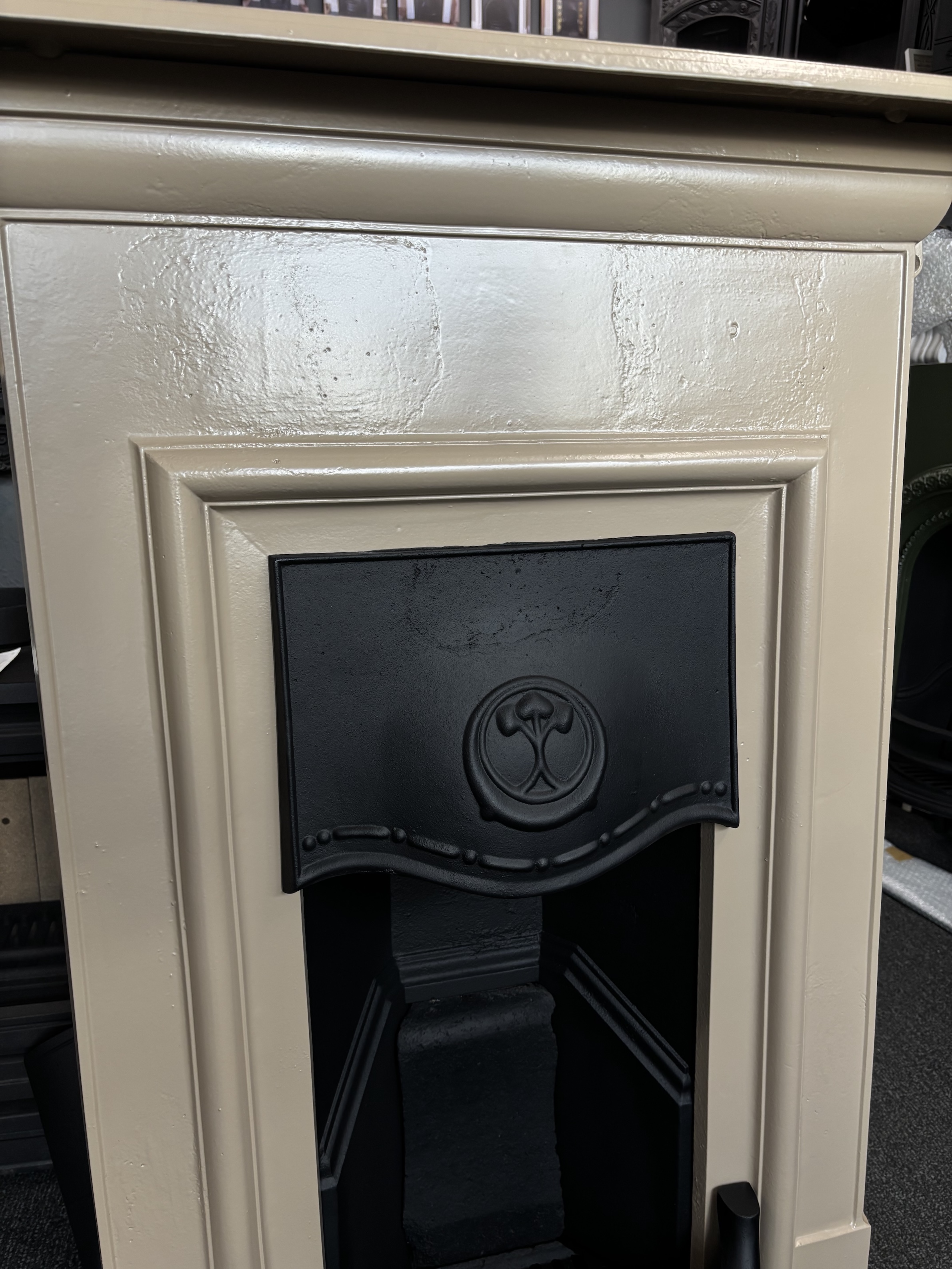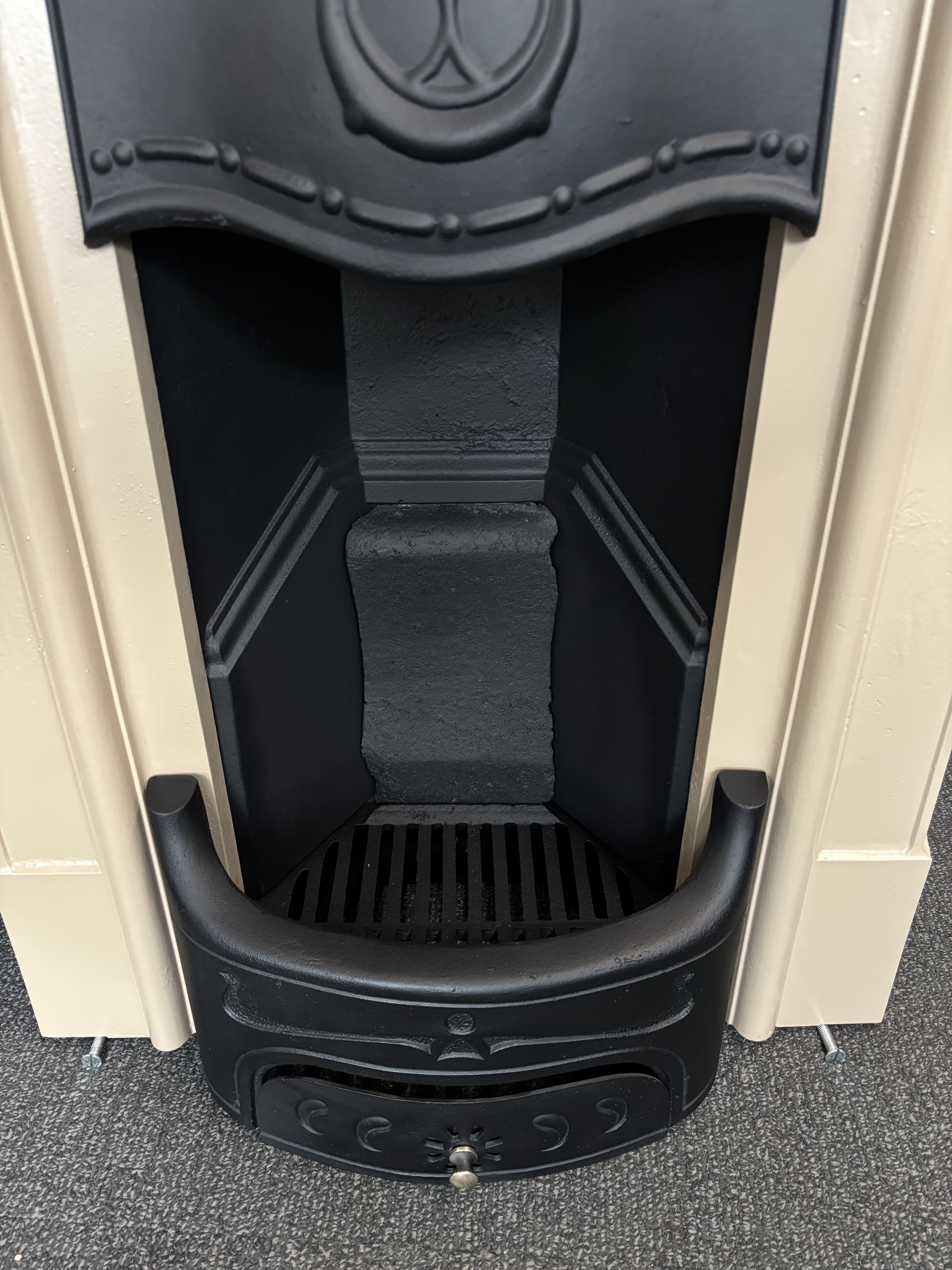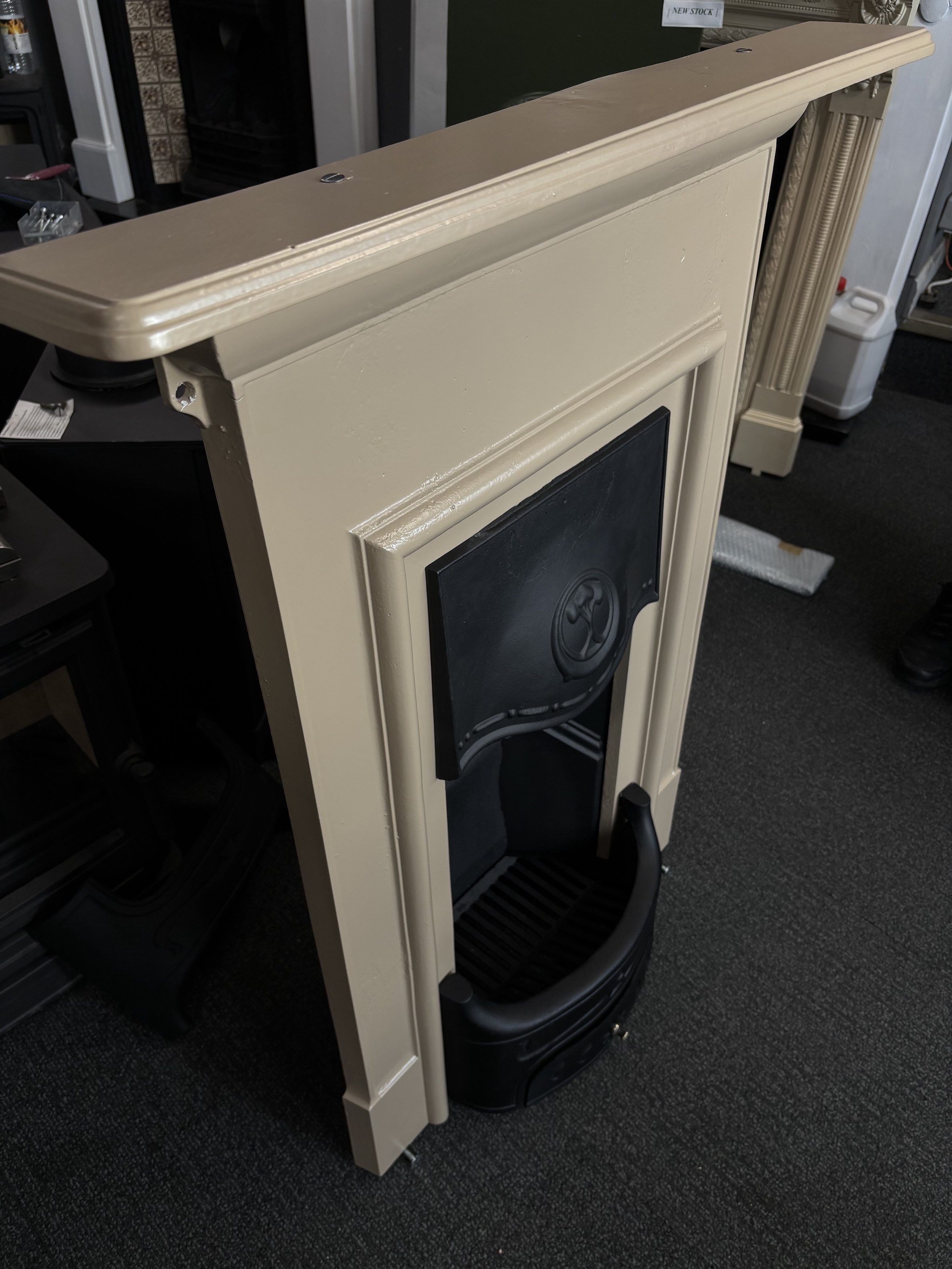 A restored antique combination fireplace dating back to the Edwardian period, offering versatility for both modern homes and traditional interiors. Made from durable cast iron, it features a light brown body with a contrasting black insert. Its compact design makes it ideal for bedrooms or smaller spaces.