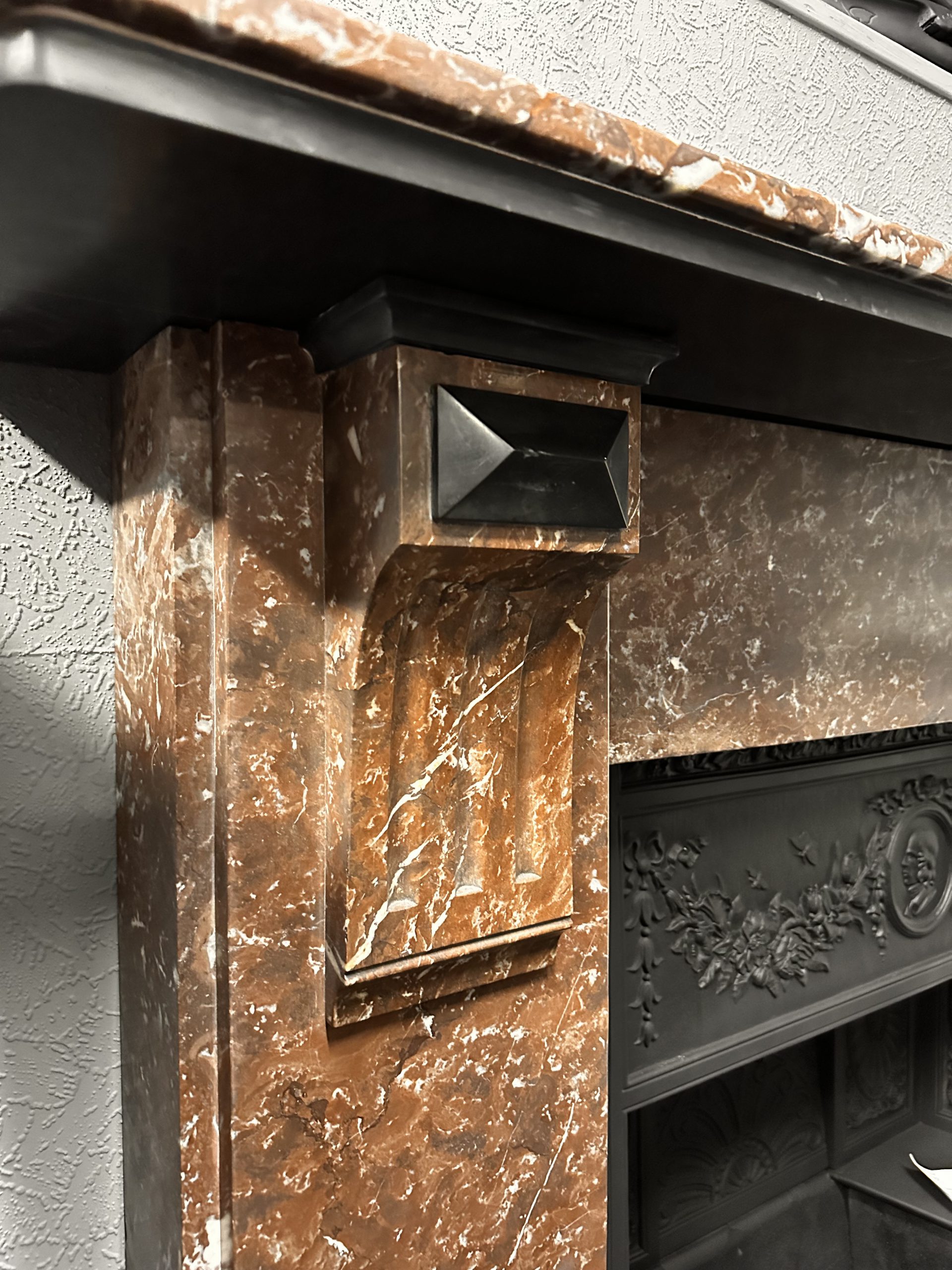 Edwardian Rouge Marble surround with Black Marble inlays. Circa 1900.