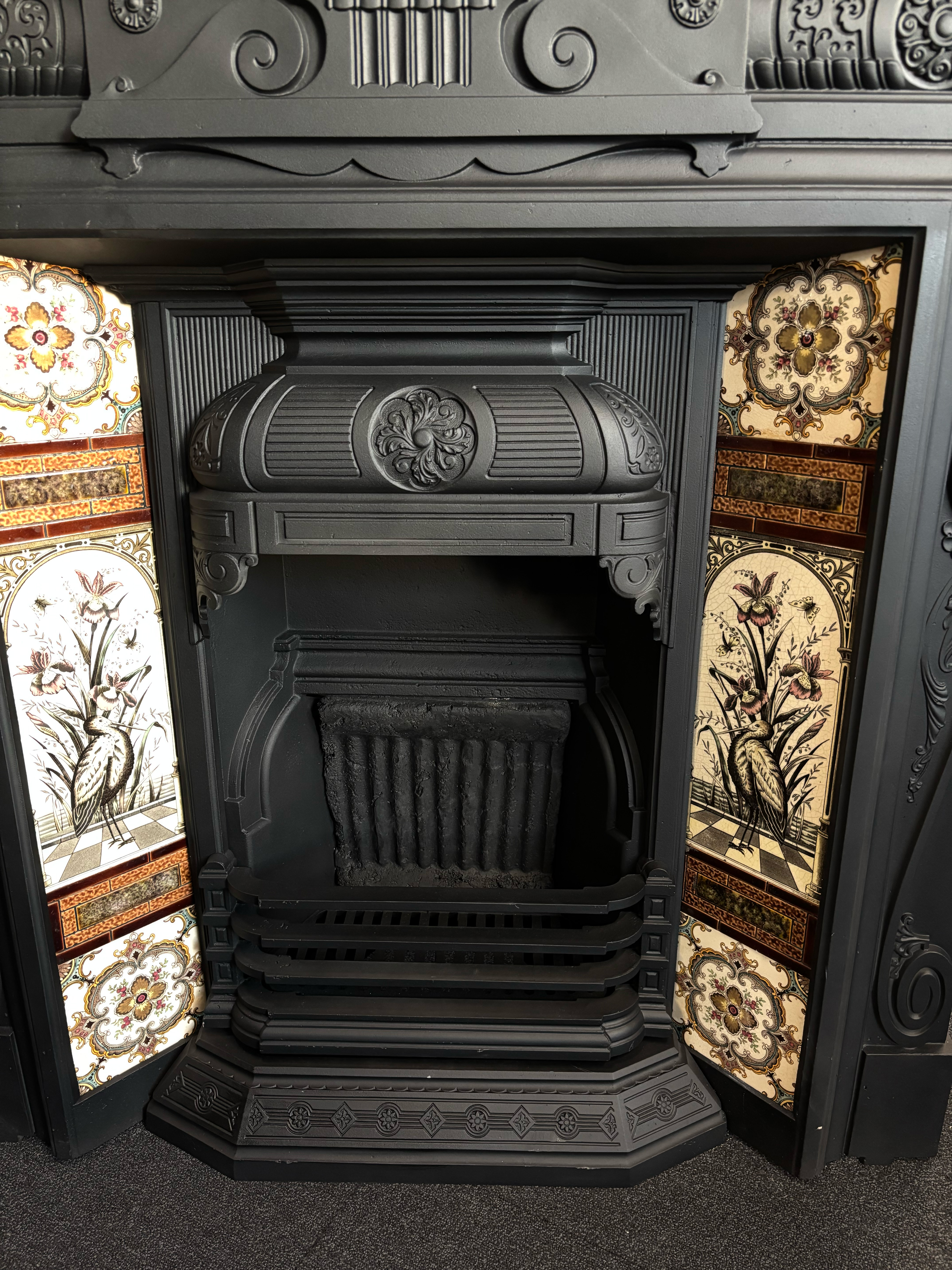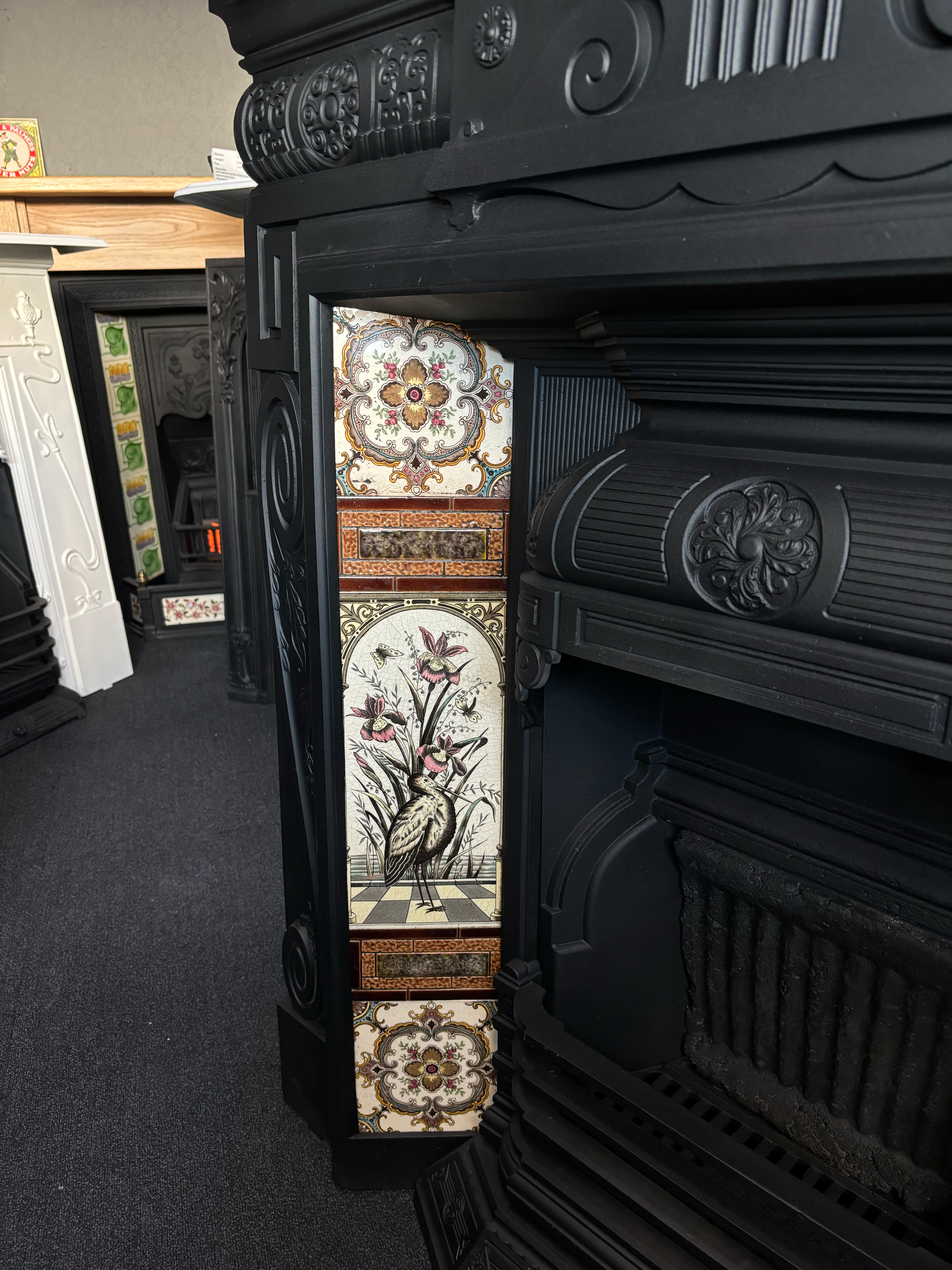 A charming Victorian fireplace finished in black, with a beautiful set of decorative tiles. The floral details on both the insert and the tiles really stand out, making this antique piece an eye-catching addition that brings character and style to any home.