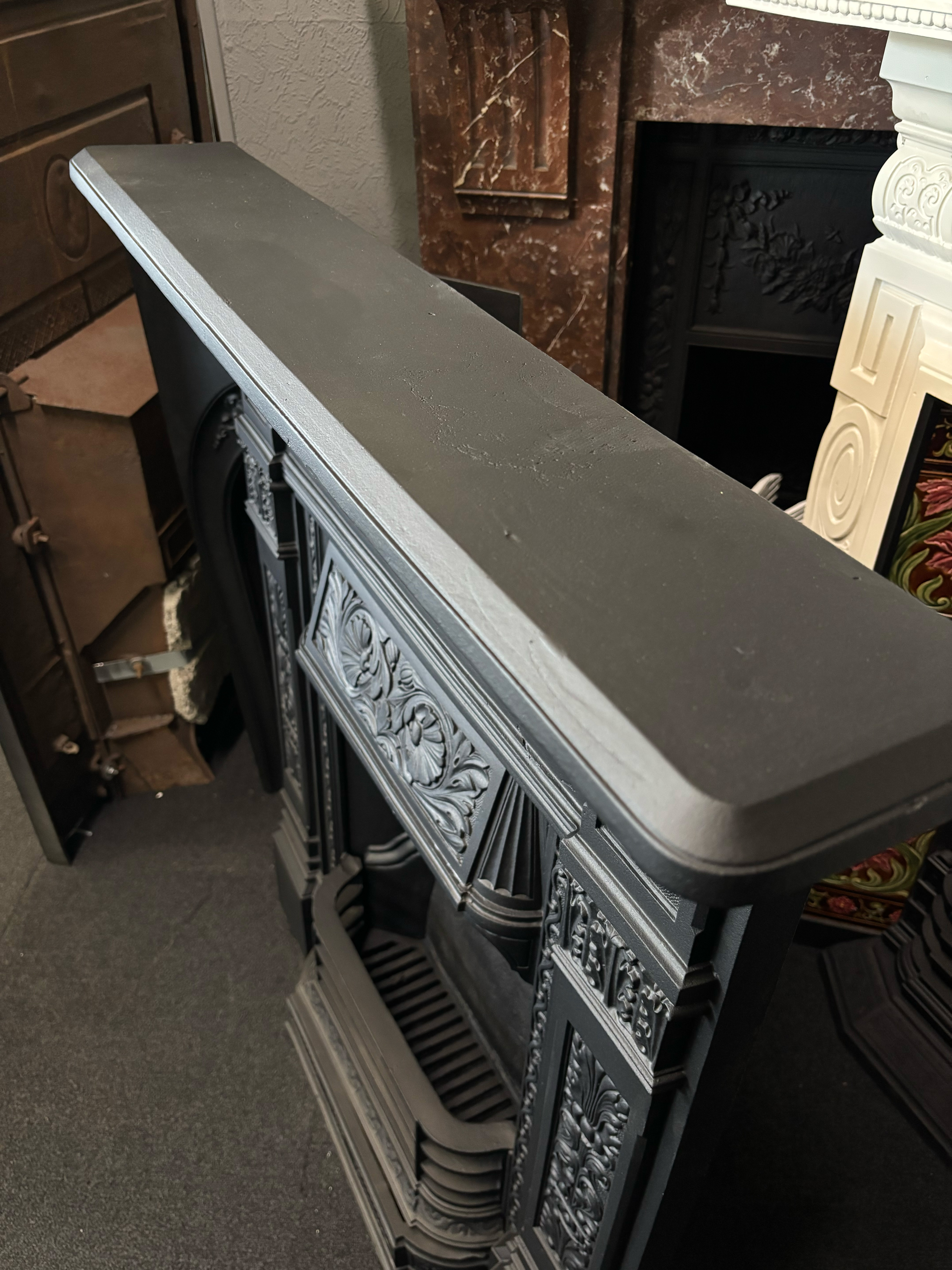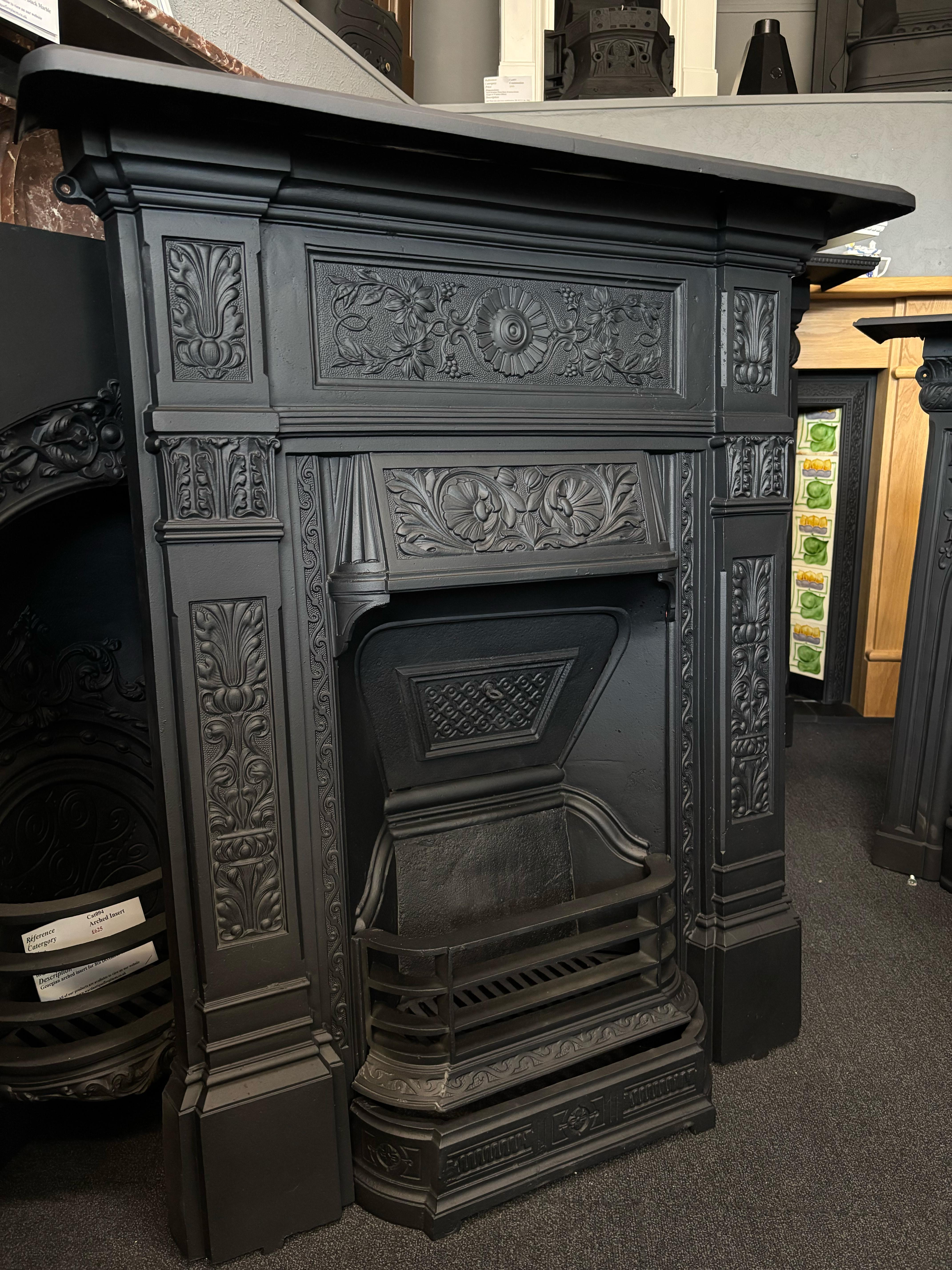 A beautifully decorated Victorian fireplace combination featuring elegant floral patterns across the main body. Finished in our signature matte black paint, this period piece creates a striking focal point in Victorian homes and interiors seeking a touch of timeless antique charm.