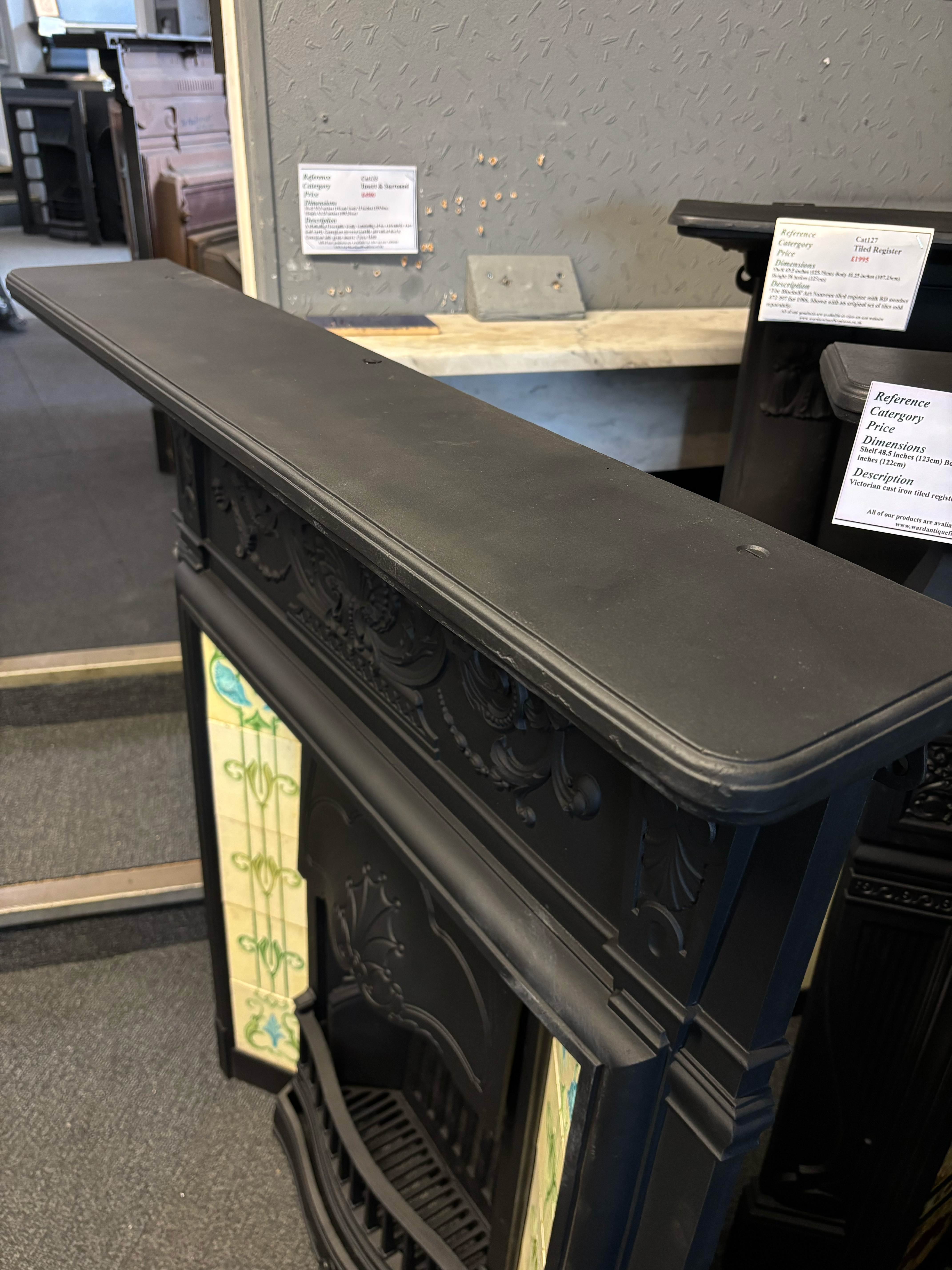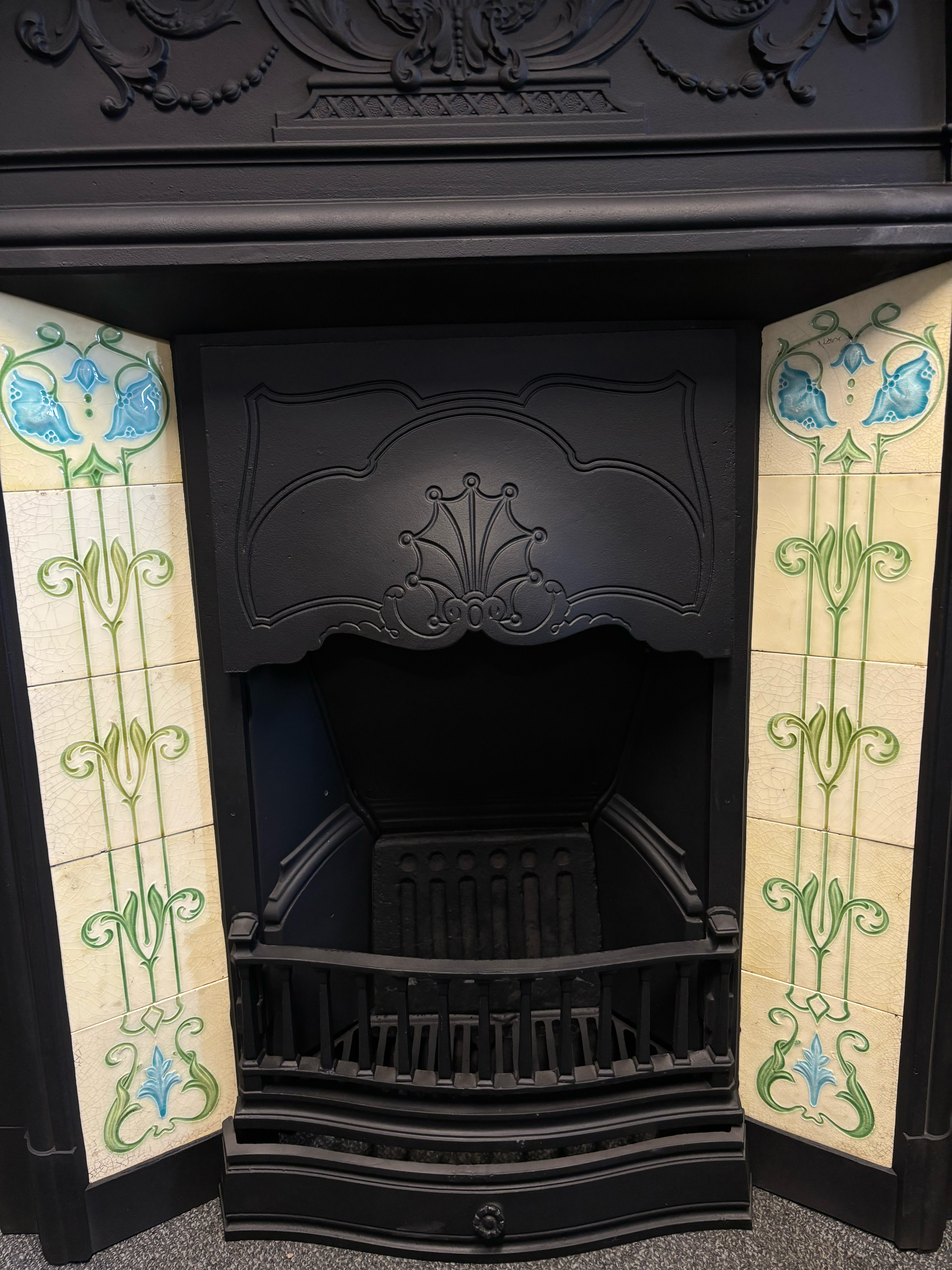 A beautiful and striking cast iron tiled register fireplace featuring a flower-decorated hood and classic period detailing. This taller tiled register fireplace retains its original parts and patterns, showcasing the craftsmanship of the Victorian era. A perfect addition to living spaces where an antique fireplace adds character and timeless elegance.