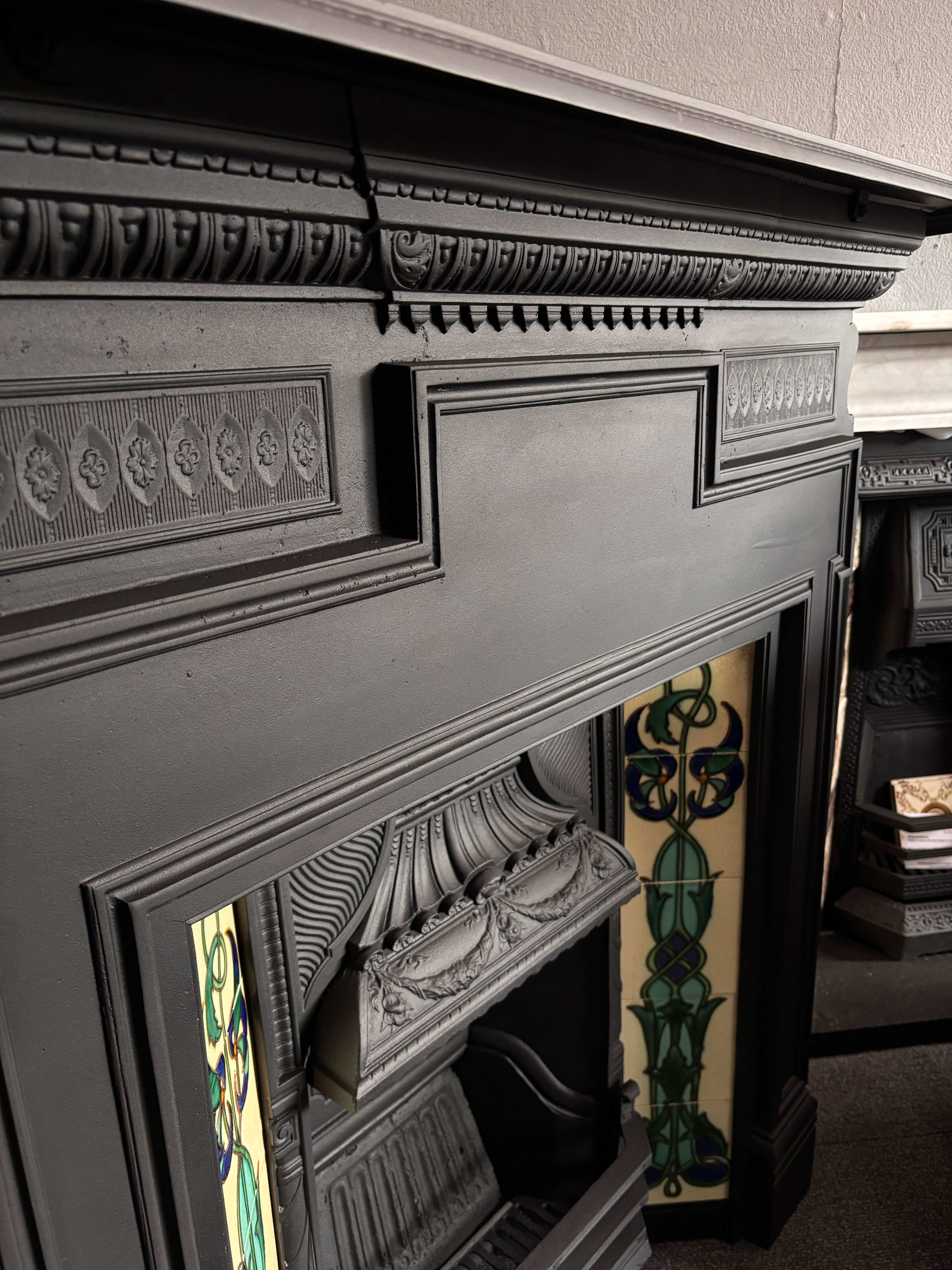 This large late Victorian tiled register by Carron is a standout piece from their antique collection. It is pictured with a set of Carter & Co tiles (sold separately) and adds charm and character to the fireplace, making it well suited to both period and modern Victorian-style homes.